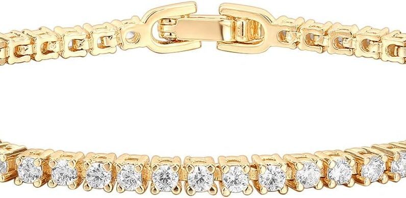 Stunning 14K gold plated tennis bracelet with AAA+ cubic zirconia stones. PAVOI 14K Gold Plated Cubic Zirconia Classic Tennis Bracelet Check on Amazon