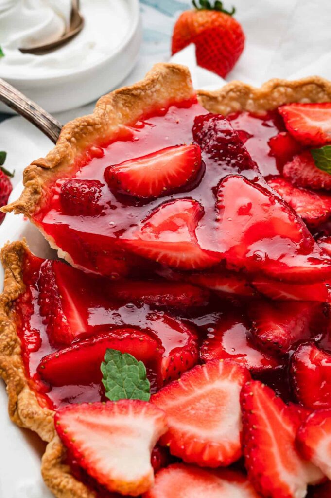 Pour the warm glaze slowly and evenly over the strawberries in the crust, tilting the pie dish slightly to help the glaze flow into all the gaps between the berries. Every berry should be coated in that beautiful, shiny glaze. Transfer the pie to the refrigerator and chill for at least 2-3 hours until the glaze is fully set. When you are ready to serve, slice with a sharp knife and top each piece with a generous dollop of whipped cream.