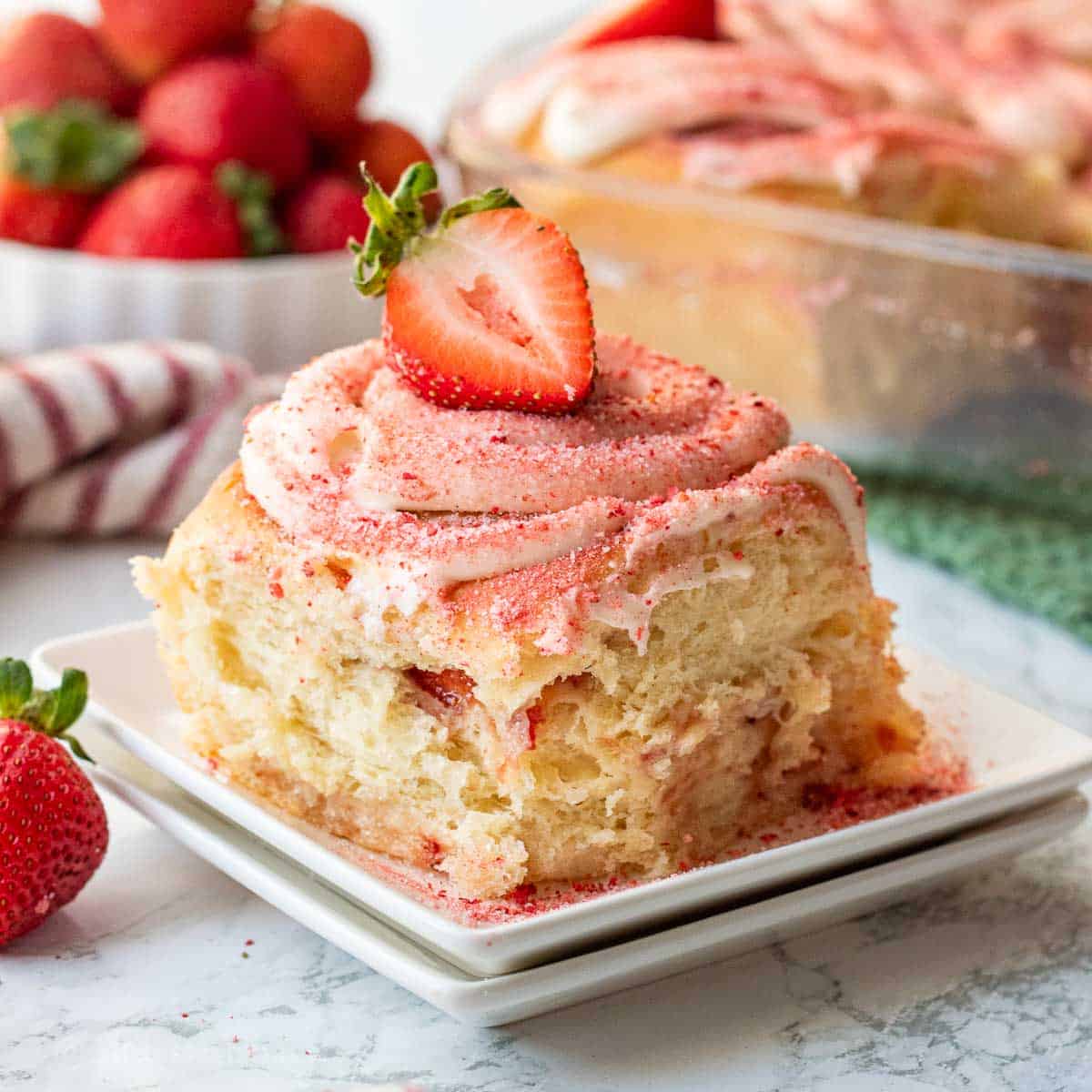 The fat from butter and eggs tenderizes the gluten strands, resulting in a softer crumb. The two rises—first as a bulk dough, then after shaping—allow for proper flavor development and ensure the rolls bake up light rather than dense. The strawberries in the filling introduce additional moisture that can make the dough soggy if not properly managed, which is why they’re chopped rather than pureed and folded in at the last moment.
