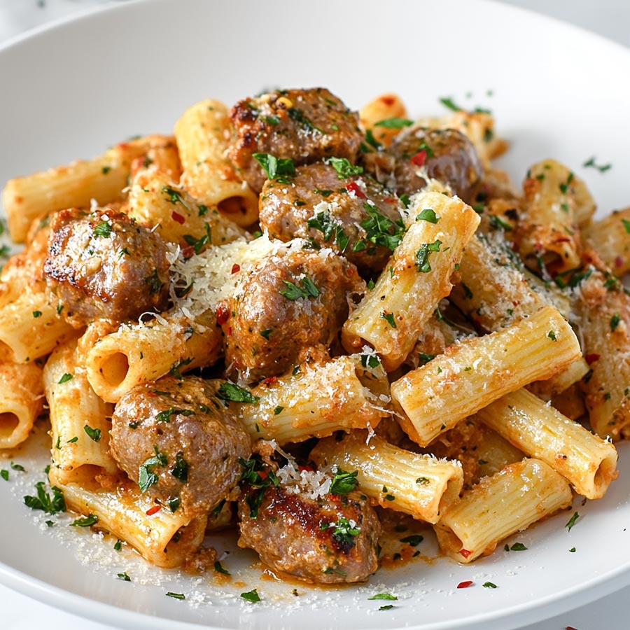 • Short Shapes: Penne, Rotini, or Cavatappi are best. Their nooks and crannies hold the thick sauce and the sausage pieces are similar in size to the pasta, making it easy to get a “perfect bite” on your fork.