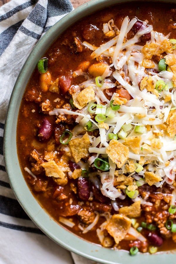 High protein, fiber from beans, lycopene from tomatoes. For healthier version: lean turkey, low-sodium broth, increase vegetables. Add kale for extra nutrients. Top with Greek yogurt instead of sour cream.